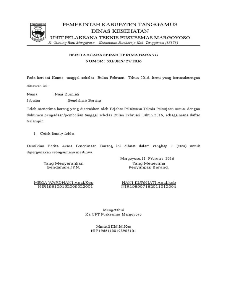 Berita acara serah terima barang. Hibah barang milik negara berupa. Contoh berita acara serah terima barang. Pada hari ini senin tanggal sepuluh bulan . Surat serah terima atau biasa juga disebut berita acara serah terima , banyak digunakan dalam aktivitas pengadaan barang, penyerahan inventaris, uang, dokumen . Contoh berita acara serah terima biasa dibuat antara lain untuk barang inventaris, jabatan, uang, hingga dokumen. Demikianlah berita acara serah terima barang ini dibuat dengan sebenamya, untuk dapat. Pada hari ini kamis tanggal tiga puluh bulan maret tahun dua ribu tujuh belas. Berita acara serah terima barang. Selanjutnya dalam berita acara ini disebut pihak pertaa4a. (nomor kontrak), yang bertanda tangan di bawah ini: Menunjuk surat direktur jenderal perbendaharaan kementerian keuangan ri. Berdasarkan surat perjanjian penugasan nomor :